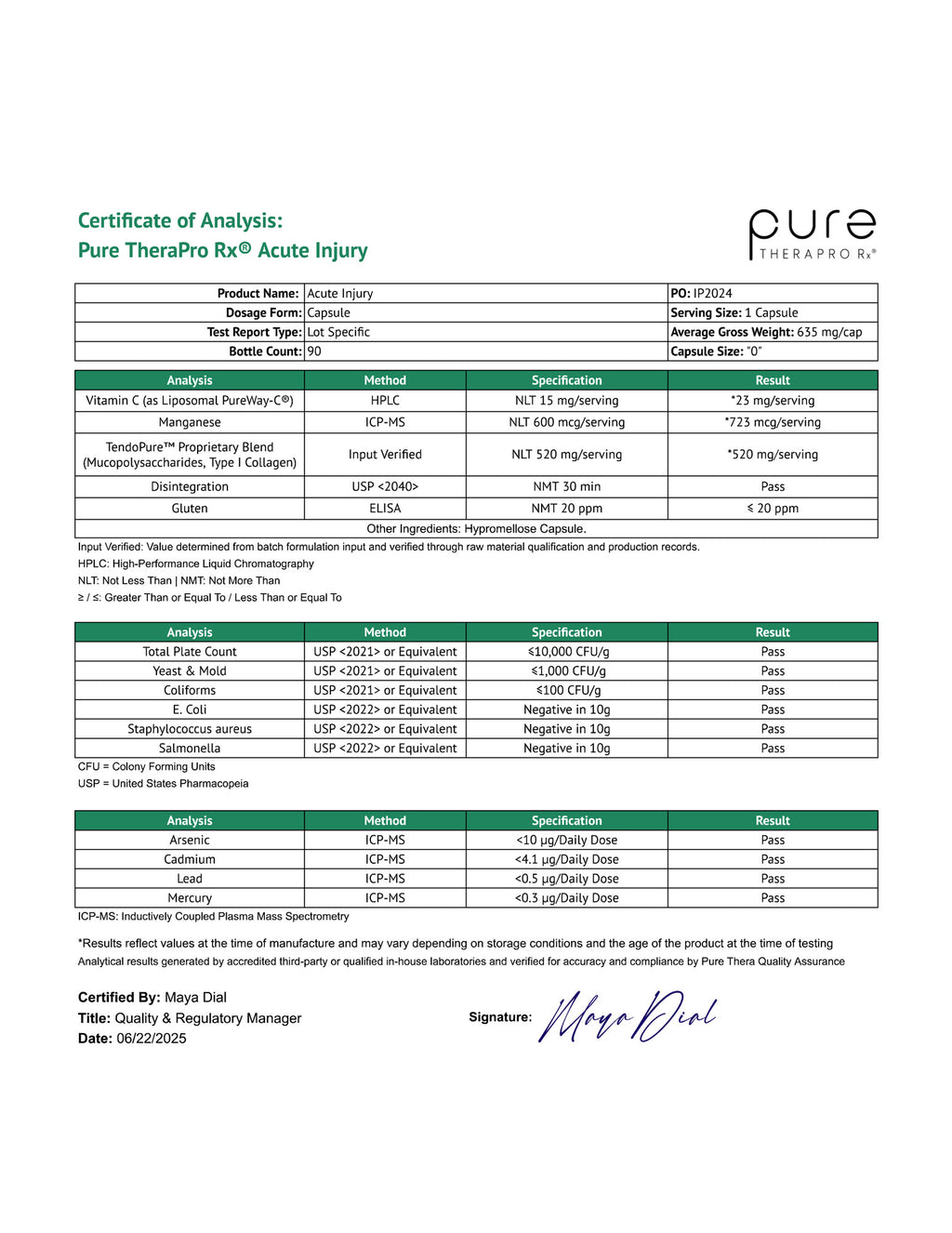 Pure TheraPro provides joint supportive solutions such as Acute Injury to ensure optimal athletic performance, activity, and support with any post-injury recovery. Pure TheraPro supplements do not contain Chinese ingredients, fillers like rice flour, corn starch, or fibers like cellulose, and our manufacturing facility adheres to strict NSF/cGMP (FDA's Current Good Manufacturing Practices) guidelines.