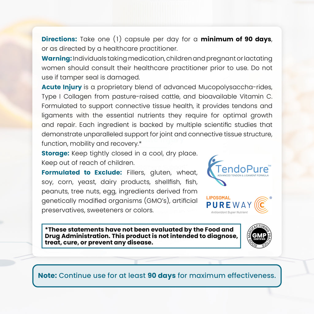 Acute injury utilizes the latest research from Europe to deliver your body the building blocks for healthy tendons. Five scientific studies support its efficacy and safety. A study published in 2009 showed that ingredients in TendoPure ® produced notifiable and measurable results in a variety of parameters among those receiving the capsules compared to control groups. This well-researched formula can help promote over 4,000 tendons in your body.