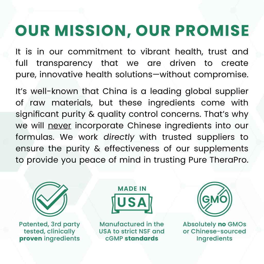 Pure Thera provides supplement solutions to ensure your body gets the micronutrients necessary to support total-body health and vitality. Pure TheraPro supplements do not contain any fillers such as rice flour, corn starch, or wood pulp fibers like cellulose. Our manufacturing facility adheres to strict NSF/cGMP (Current Good Manufacturing Practices) guidelines.