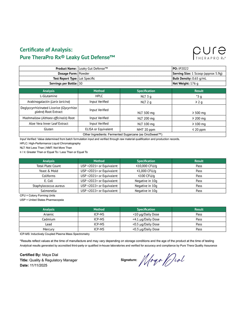 Leaky Gut Defense™ is an advanced formula designed to help reverse ‘leaky gut’ (compromised intestinal permeability). This mild-flavored non-GMO blend includes: L-Glutamine to bolster the integrity of the GI tract's mucosal lining, as well as nourish and repair the gut's thin and delicate cell wall. Arabinogalactan, from the Larch Tree, encourages a balanced immune system response and serves as a food source for beneficial gut bacteria. Probiotics transform arabinogalactan into vital short-chain fatty acids which support an optimal inflammatory response in the gut. Deglycyrrhizinated Licorice (DGL), processed to remove the component associated with blood pressure increases, supports the protective lining of the stomach and intestinal wall. Aloe Vera, rich in enzymes and glyconutrients, is utilized to promote gut barrier repair, serve as a prebiotic, and support a healthy inflammatory response.