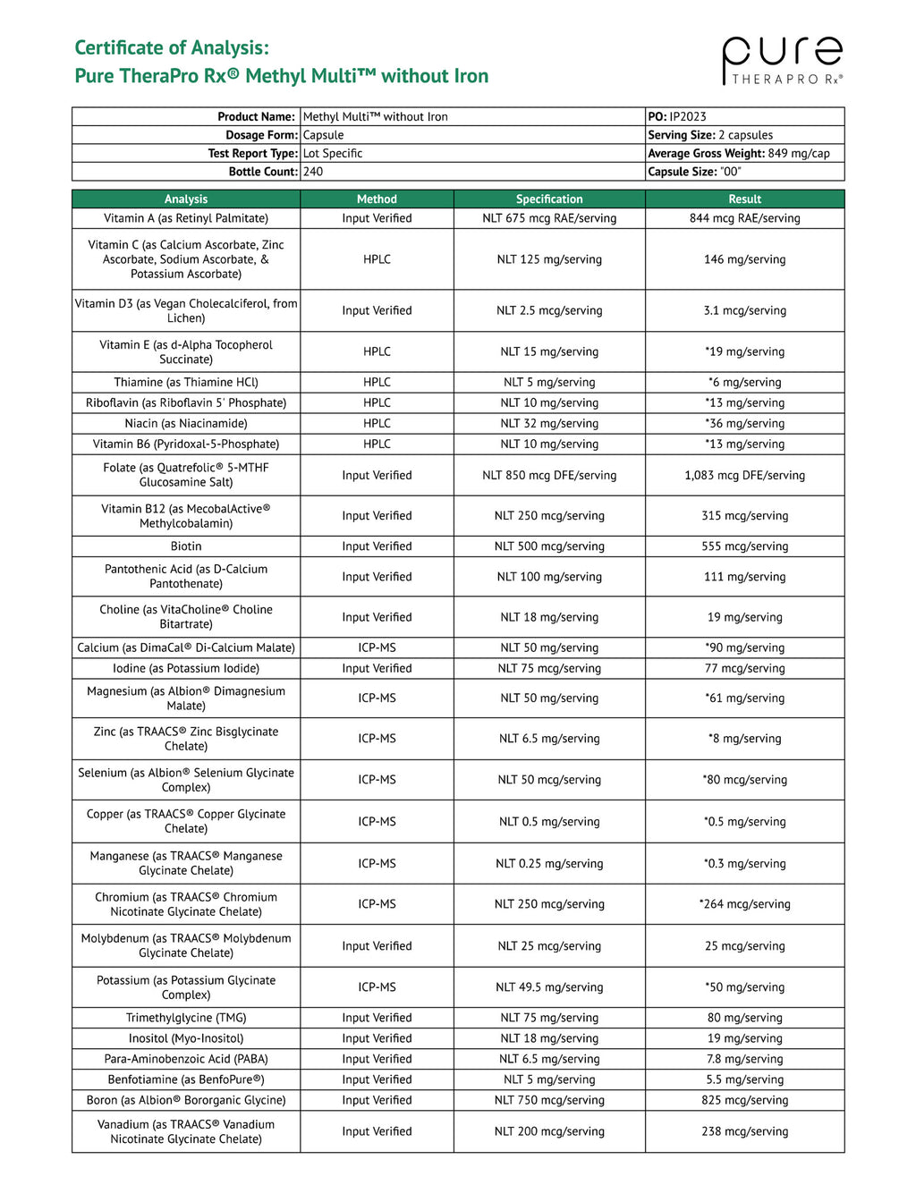 Methyl Multi™ without Iron is a proprietary multivitamin/mineral blend made from high-quality, hypoallergenic vegan ingredients.