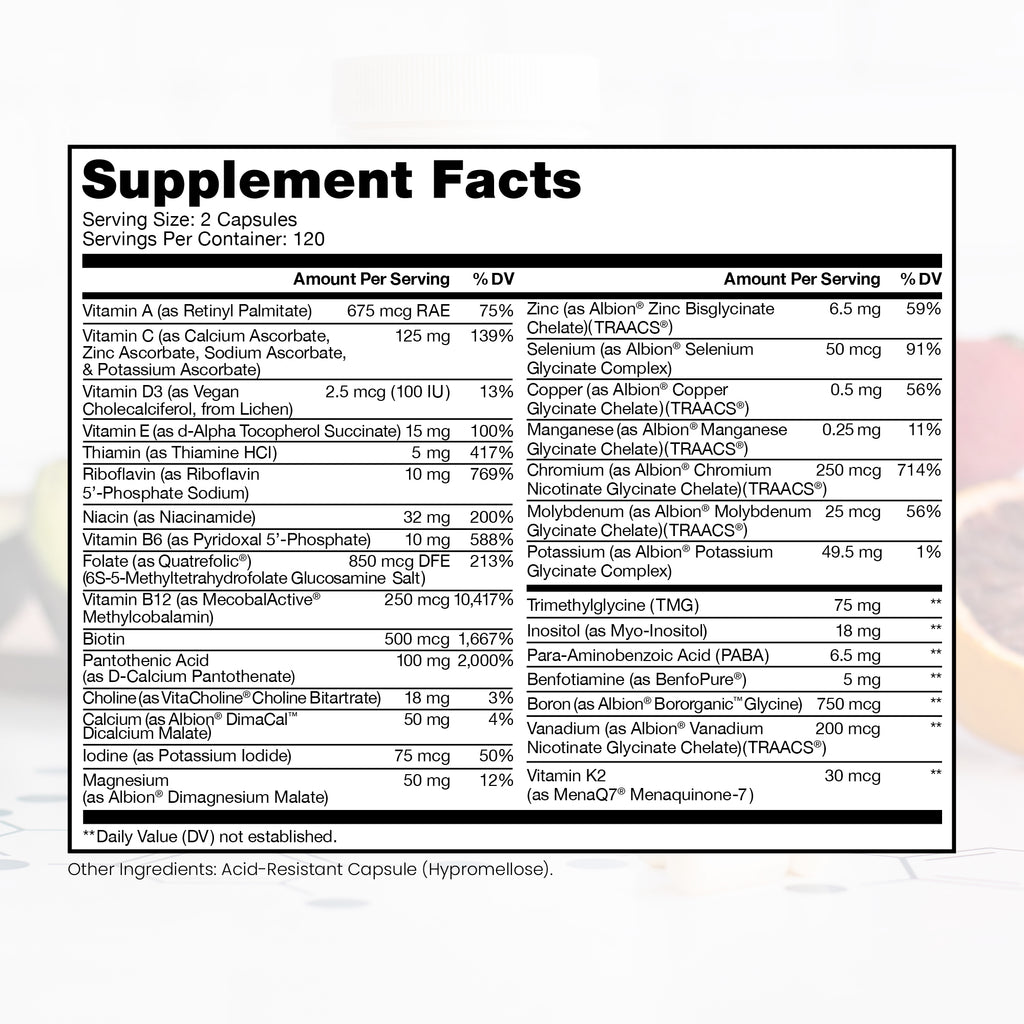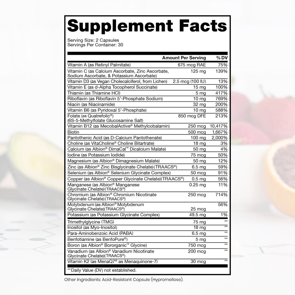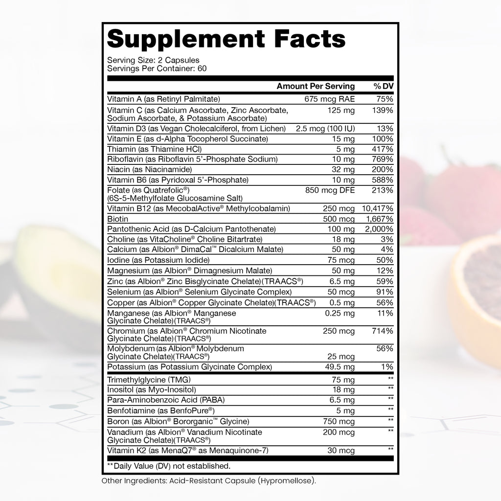 Vitamin A (as Retinyl Palmitate) 420 mcg; Vitamin C (as Calcium Ascorbate, Zinc Ascorbate, Sodium Ascorbate, & Potassium Ascorbate) 125 mg; Vitamin D3 (as Vegan Cholecalciferol, from Lichen) 2.5 mcg (100 IU); Vitamin E (as D-Alpha mixed tocopherols) 67 mg; Thiamin (as BenfoPure® Benfotiamine) 10 mg; Riboflavin (as Riboflavin 5’-Phosphate Sodium) 10 mg; Niacin (as Niacinamide) 32 mg; Vitamin B6 (as Pyridoxal 5’-Phosphate) 10 mg; Folate [from (6S)-5-Methyltetrahydrofolate Glucosamine Salt (Quatrefolic®)] 850 mcg DFE; Vitamin B12 (as MecobalActive® Methylcobalamin) 250 mcg; Biotin 500 mcg; Pantothenic Acid (as D-Calcium Pantothenate) 100 mg; Calcium (as DimaCal® Di-Calcium Malate) 50 mg; Iodine (as Potassium Iodide) 50 mcg; Magnesium (as Albion® Dimagnesium Malate) 50 mg; Zinc (as TRAACS® Zinc Bisglycinate Chelate) 6.5 mg; Selenium (as Albion® Selenium Glycinate Complex) 50 mcg; Copper (as TRAACS® Copper Glycinate Chelate) 0.5 mg; Manganese (as TRAACS® Manganese Glycinate Chelate) 0.25 mg; Chromium (as TRAACS® Chromium Nicotinate Glycinate Chelate) 250 mcg; Molybdenum (as TRAACS® Molybdenum Glycinate Chelate) 25 mcg; Potassium (as Albion® Potassium Glycinate Complex) 49.5 mg; Trimethylglycine (TMG) 75 mg; Choline (as VitaCholine® Choline Bitartrate) 18 mg; Inositol (as Myo-Inositol) 18 mg; Para-Aminobenzoic Acid (PABA) 6.5 mg; Boron (as Albion® Bororganic™ Glycine) 750 mcg; Vanadium (as TRAACS® Vanadium Nicotinate Glycinate Chelate) 200 mcg; Vitamin K2 MK-7 (MenaQ7® as Menaquinone-7) 30 mcg