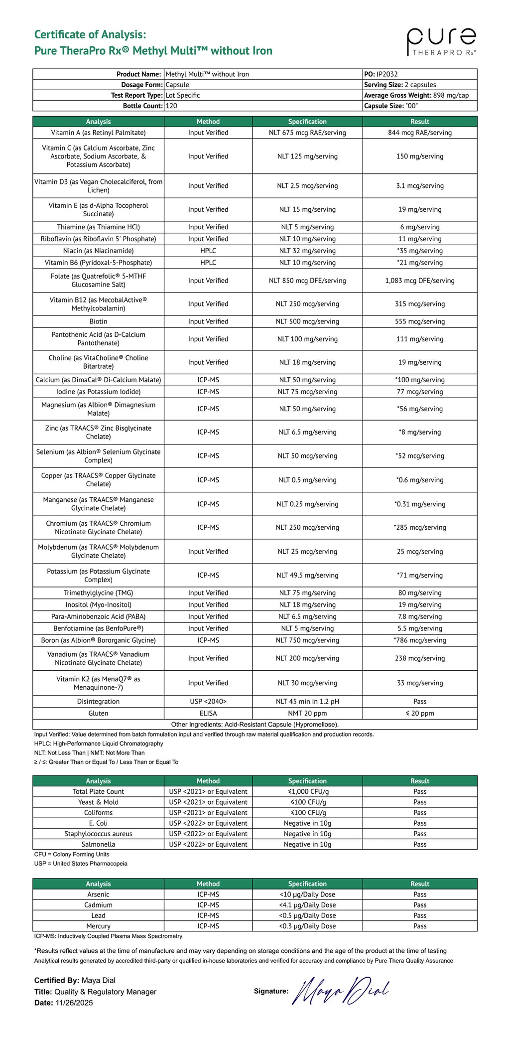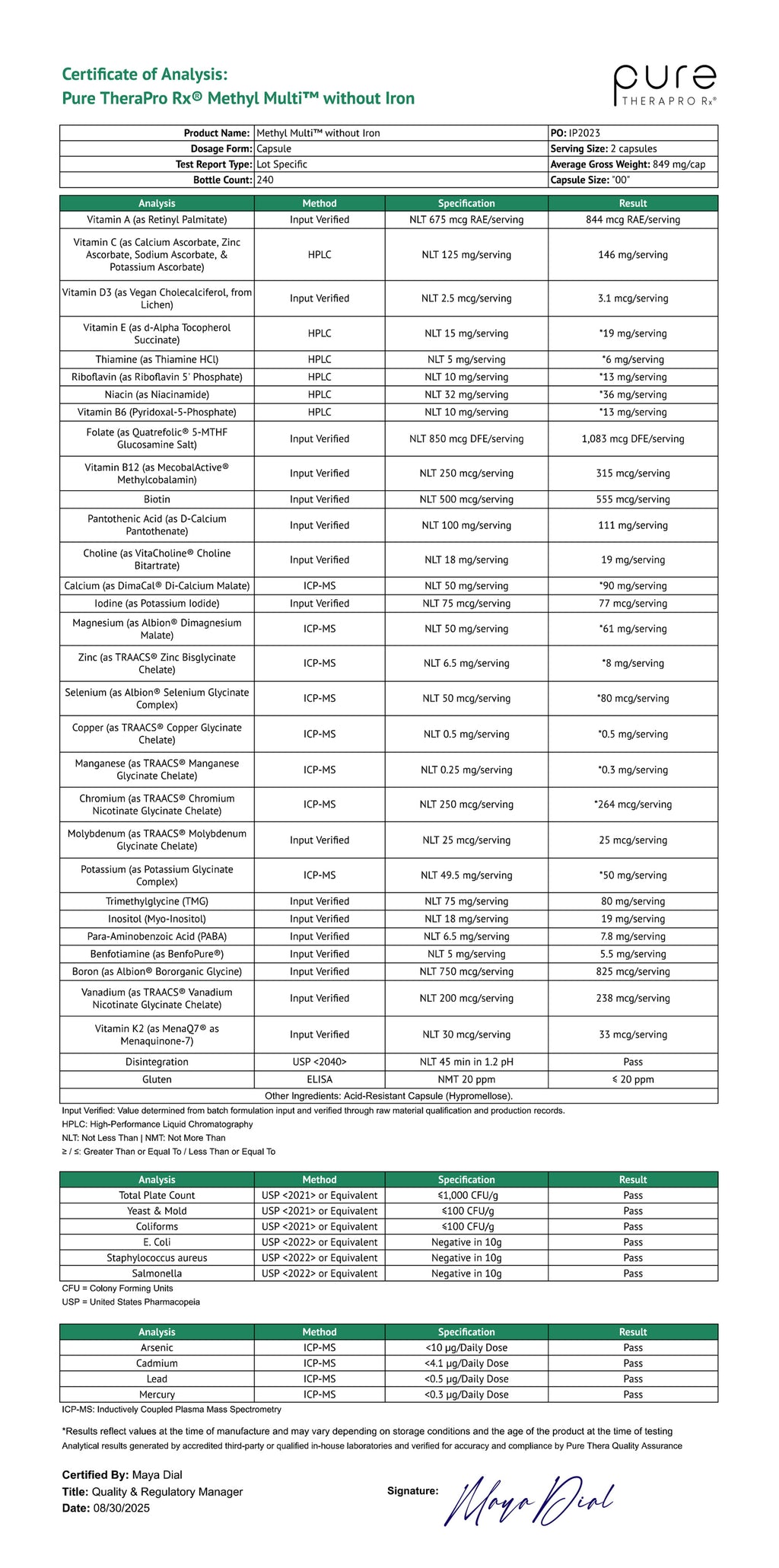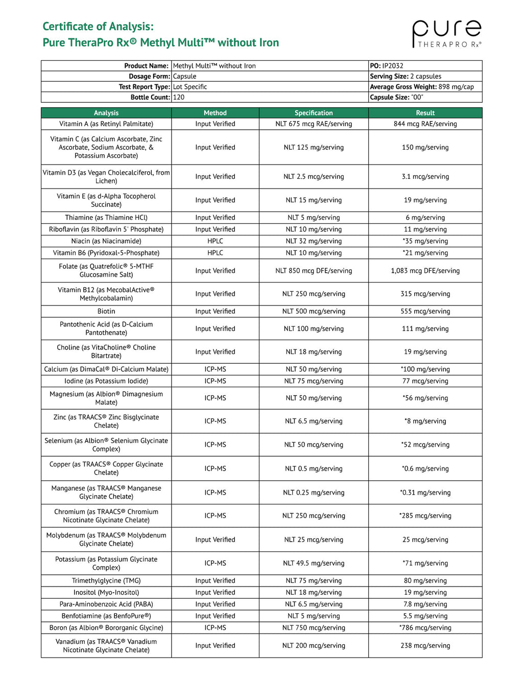 Vitamin A (as Retinyl Palmitate) 420 mcg; Vitamin C (as Calcium Ascorbate, Zinc Ascorbate, Sodium Ascorbate, & Potassium Ascorbate) 125 mg; Vitamin D3 (as Vegan Cholecalciferol, from Lichen) 2.5 mcg (100 IU); Vitamin E (as D-Alpha mixed tocopherols) 67 mg; Thiamin (as BenfoPure® Benfotiamine) 10 mg; Riboflavin (as Riboflavin 5’-Phosphate Sodium) 10 mg; Niacin (as Niacinamide) 32 mg; Vitamin B6 (as Pyridoxal 5’-Phosphate) 10 mg; Folate [from (6S)-5-Methyltetrahydrofolate Glucosamine Salt (Quatrefolic®)] 850 mcg DFE; Vitamin B12 (as MecobalActive® Methylcobalamin) 250 mcg; Biotin 500 mcg; Pantothenic Acid (as D-Calcium Pantothenate) 100 mg; Calcium (as DimaCal® Di-Calcium Malate) 50 mg; Iodine (as Potassium Iodide) 50 mcg; Magnesium (as Albion® Dimagnesium Malate) 50 mg; Zinc (as TRAACS® Zinc Bisglycinate Chelate) 6.5 mg; Selenium (as Albion® Selenium Glycinate Complex) 50 mcg; Copper (as TRAACS® Copper Glycinate Chelate) 0.5 mg; Manganese (as TRAACS® Manganese Glycinate Chelate) 0.25 mg; Chromium (as TRAACS® Chromium Nicotinate Glycinate Chelate) 250 mcg; Molybdenum (as TRAACS® Molybdenum Glycinate Chelate) 25 mcg; Potassium (as Albion® Potassium Glycinate Complex) 49.5 mg; Trimethylglycine (TMG) 75 mg; Choline (as VitaCholine® Choline Bitartrate) 18 mg; Inositol (as Myo-Inositol) 18 mg; Para-Aminobenzoic Acid (PABA) 6.5 mg; Boron (as Albion® Bororganic™ Glycine) 750 mcg; Vanadium (as TRAACS® Vanadium Nicotinate Glycinate Chelate) 200 mcg; Vitamin K2 MK-7 (MenaQ7® as Menaquinone-7) 30 mcg