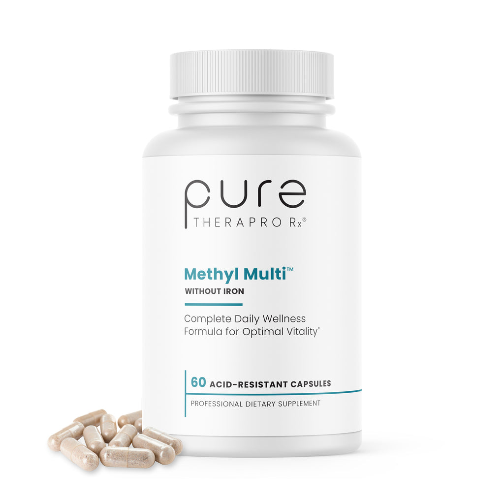 Methyl Multi without Iron™ is formulated with only the highest quality vitamins and minerals in their most desirable forms, suitable even for the millions of Americans with MTHFR and COMT mutations. At PureTheraPro Rx®, we utilized only the finest patented Quatrefolic® Folate, Albion® TRAACS® mineral chelates, as well as other micronutrients in their coenzyme and pre-methylated forms for optimal absorption and bioavailability.