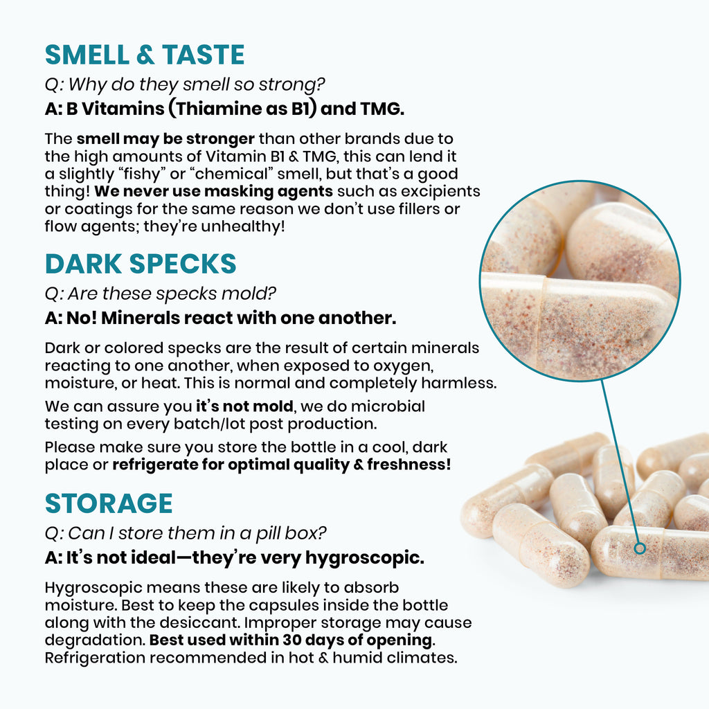 **AROMA** Our Methyl Multi is manufactured to the world's highest standards without using fillers, excipients, flow agents, flavors or binders. These unhealthy ingredients are often used to "mask" the natural aroma of nutrients such as Vitamin B1 (Thiamine) or TMG (trimethylglycine). Because of the therapeutic amounts of these nutrients that we use, and the fact that we do not use masking agents of any kind, Methyl Multi may have a "fishy", "chemical", "bile" or "rubber" smell to some. This aroma can change from batch to batch, and due to perception variability, it may smell different to different people, or not at all to others. This is not a bad thing and is completely normal! Don't be alarmed if the smell of our Methyl Multi is slightly off-putting to you!