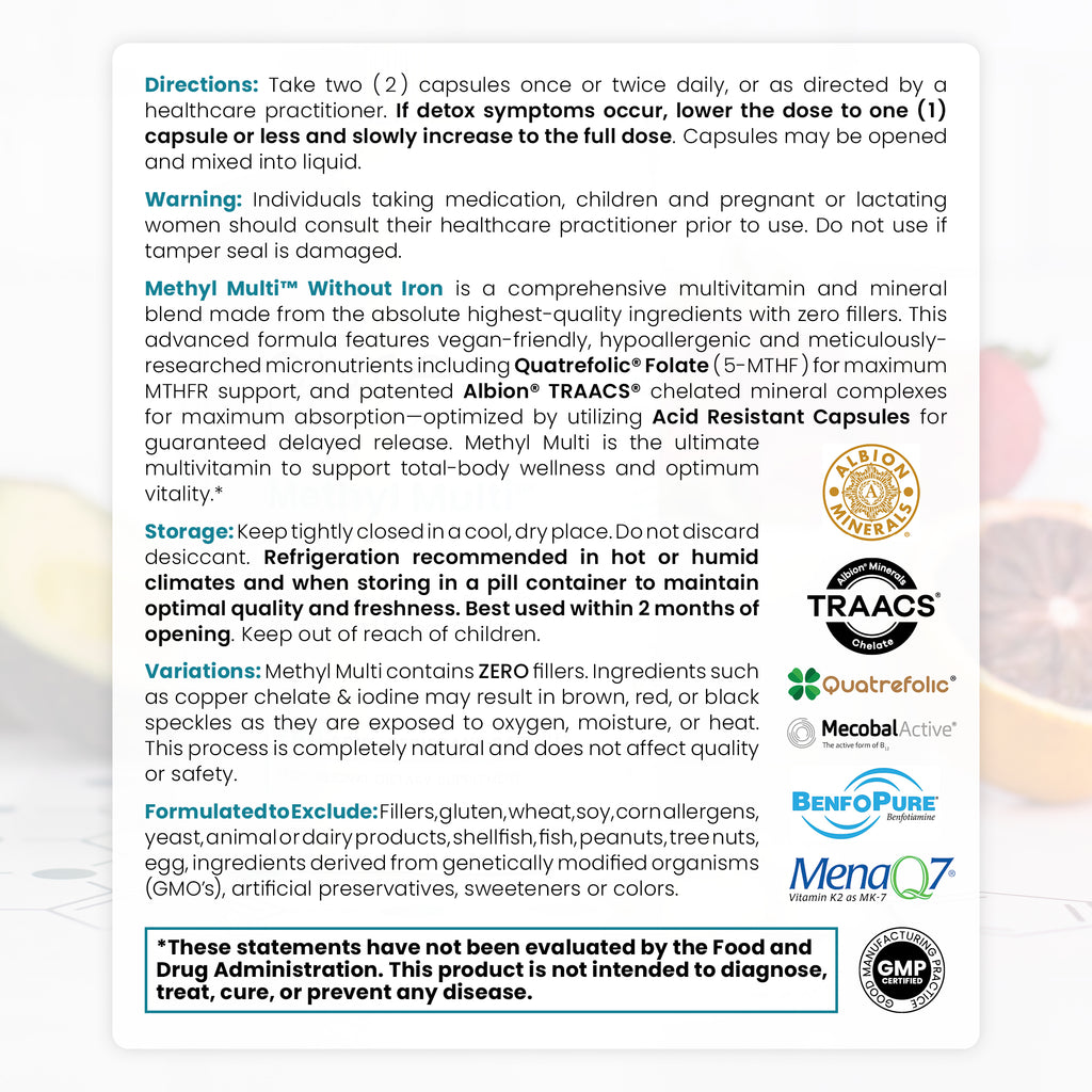 Methyl Multi™ Without Iron is a comprehensive multivitamin and mineral blend made from the absolute highest-quality ingredients with zero fillers.