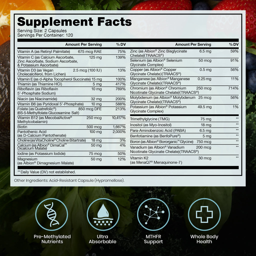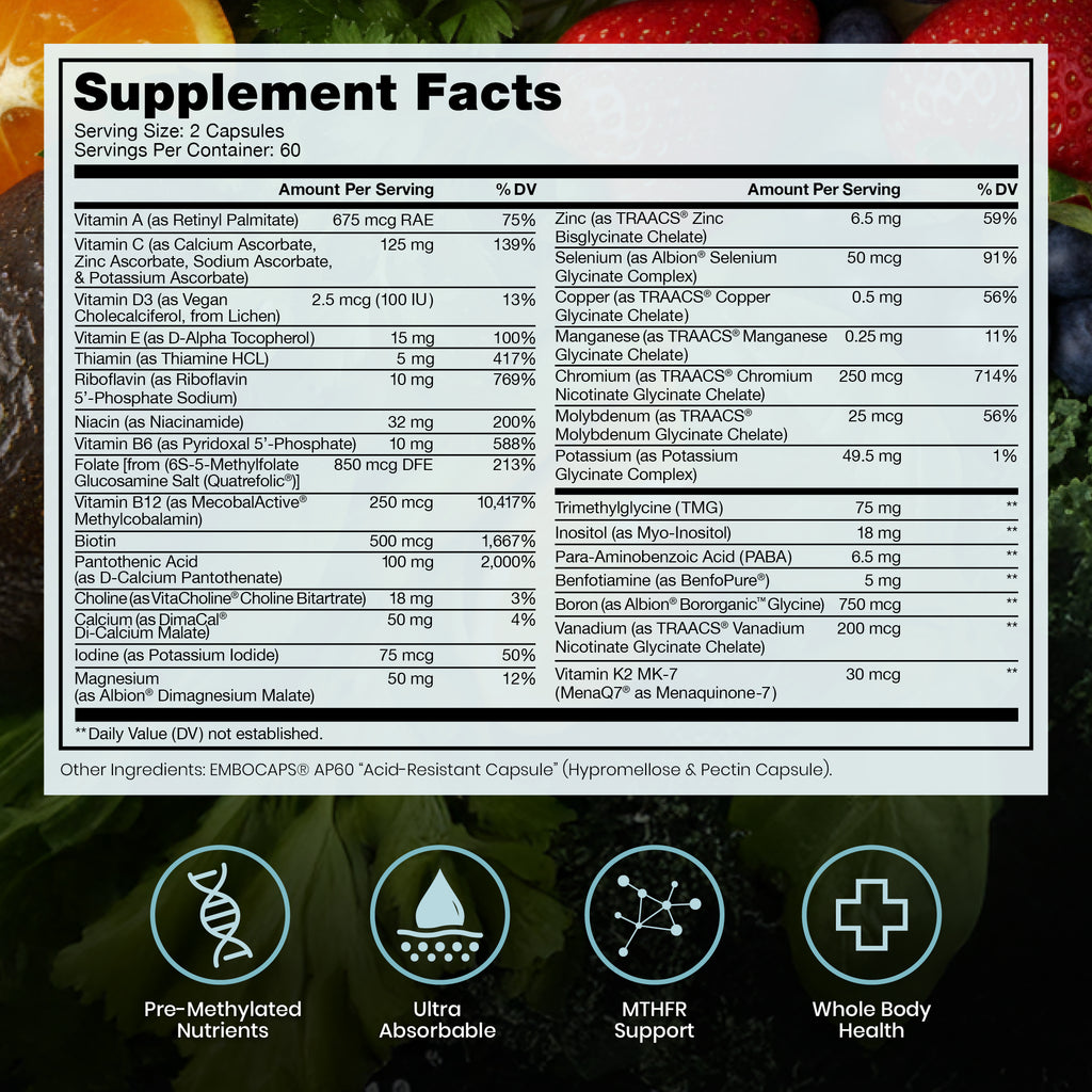 Vitamin A (as Retinyl Palmitate) 420 mcg; Vitamin C (as Calcium Ascorbate, Zinc Ascorbate, Sodium Ascorbate, & Potassium Ascorbate) 125 mg; Vitamin D3 (as Vegan Cholecalciferol, from Lichen) 2.5 mcg (100 IU); Vitamin E (as D-Alpha mixed tocopherols) 67 mg; Thiamin (as BenfoPure® Benfotiamine) 10 mg; Riboflavin (as Riboflavin 5’-Phosphate Sodium) 10 mg; Niacin (as Niacinamide) 32 mg; Vitamin B6 (as Pyridoxal 5’-Phosphate) 10 mg; Folate [from (6S)-5-Methyltetrahydrofolate Glucosamine Salt (Quatrefolic®)] 850 mcg DFE; Vitamin B12 (as MecobalActive® Methylcobalamin) 250 mcg; Biotin 500 mcg; Pantothenic Acid (as D-Calcium Pantothenate) 100 mg; Calcium (as DimaCal® Di-Calcium Malate) 50 mg; Iodine (as Potassium Iodide) 50 mcg; Magnesium (as Albion® Dimagnesium Malate) 50 mg; Zinc (as TRAACS® Zinc Bisglycinate Chelate) 6.5 mg; Selenium (as Albion® Selenium Glycinate Complex) 50 mcg; Copper (as TRAACS® Copper Glycinate Chelate) 0.5 mg; Manganese (as TRAACS® Manganese Glycinate Chelate) 0.25 mg; Chromium (as TRAACS® Chromium Nicotinate Glycinate Chelate) 250 mcg; Molybdenum (as TRAACS® Molybdenum Glycinate Chelate) 25 mcg; Potassium (as Albion® Potassium Glycinate Complex) 49.5 mg; Trimethylglycine (TMG) 75 mg; Choline (as VitaCholine® Choline Bitartrate) 18 mg; Inositol (as Myo-Inositol) 18 mg; Para-Aminobenzoic Acid (PABA) 6.5 mg; Boron (as Albion® Bororganic™ Glycine) 750 mcg; Vanadium (as TRAACS® Vanadium Nicotinate Glycinate Chelate) 200 mcg; Vitamin K2 MK-7 (MenaQ7® as Menaquinone-7) 30 mcg
