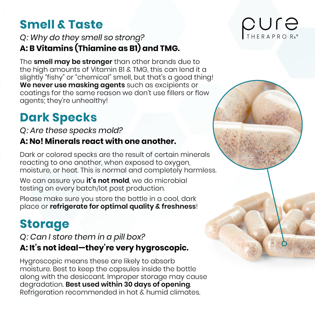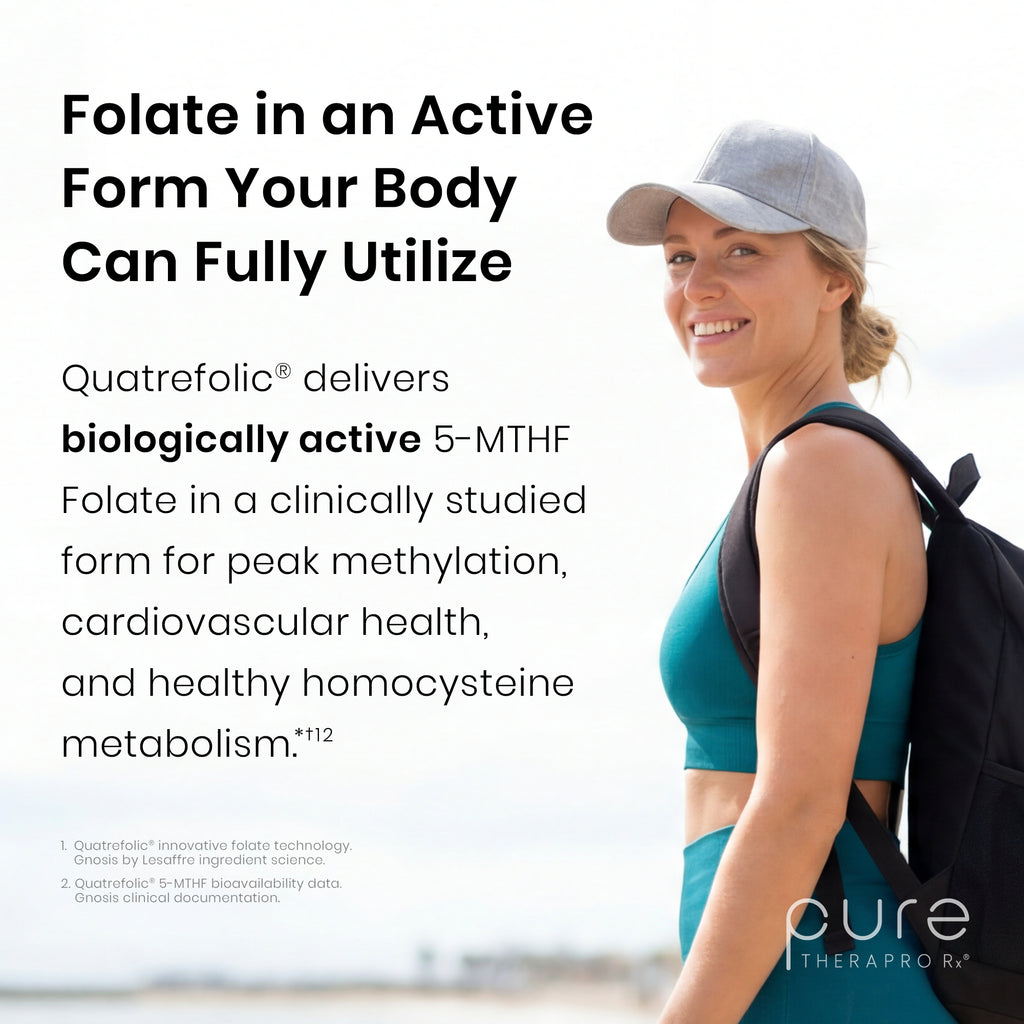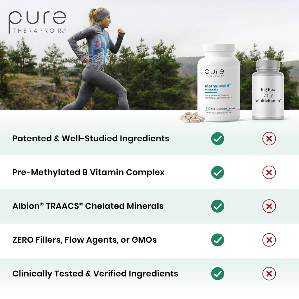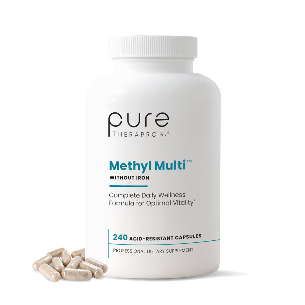 Methyl Multi without Iron™ is formulated with only the highest quality vitamins and minerals in their most desirable forms, suitable even for the millions of Americans with MTHFR and COMT mutations. At PureTheraPro Rx®, we utilized only the finest patented Quatrefolic® Folate, Albion® TRAACS® mineral chelates, as well as other micronutrients in their coenzyme and pre-methylated forms for optimal absorption and bioavailability.
