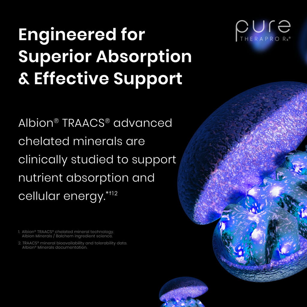 This formulation features activated-vitamin cofactors and Folate as Quatrefolic® (5-MTHF) for optimal utilization with patented Albion® TRAACS® chelated mineral complexes in vegetarian capsules.