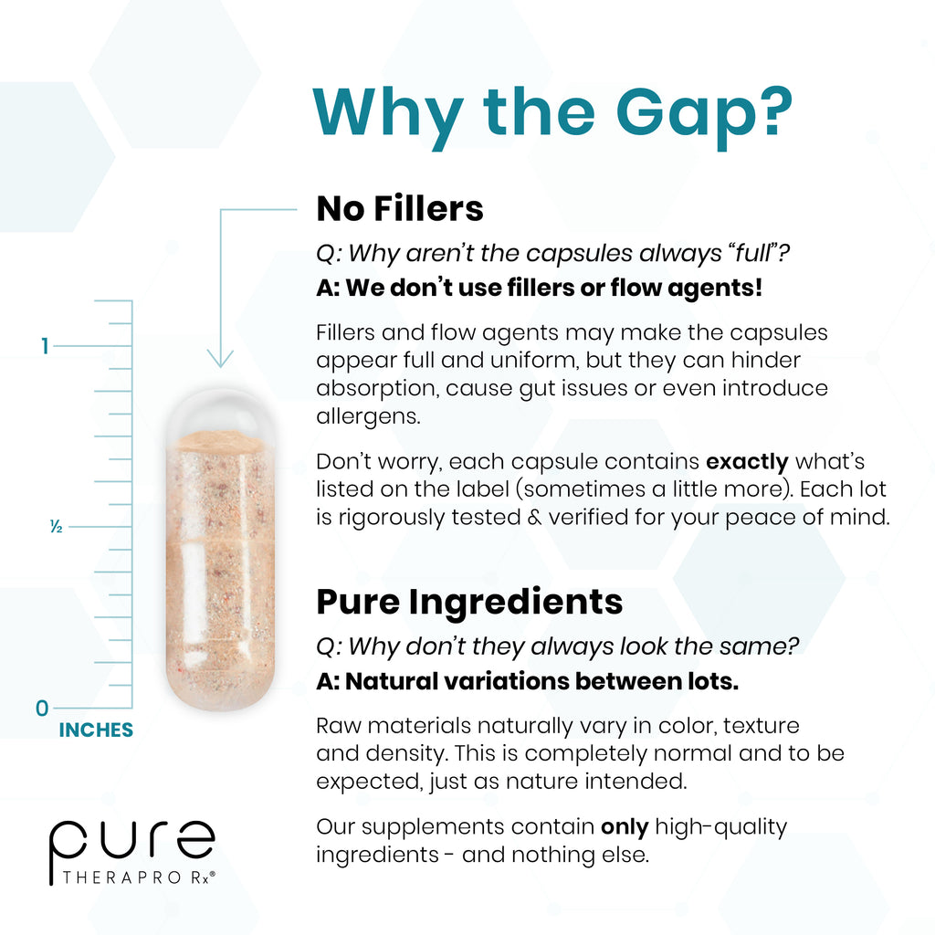 Pure TheraPro Rx® provides supplement solutions to ensure your body gets the micronutrients necessary to support total-body health and vitality. Pure TheraPro Rx® supplements do not contain any fillers such as rice flour, corn starch, or wood pulp fibers like cellulose. Our manufacturing facility adheres to strict NSF/cGMP (Current Good Manufacturing Practices) guidelines.