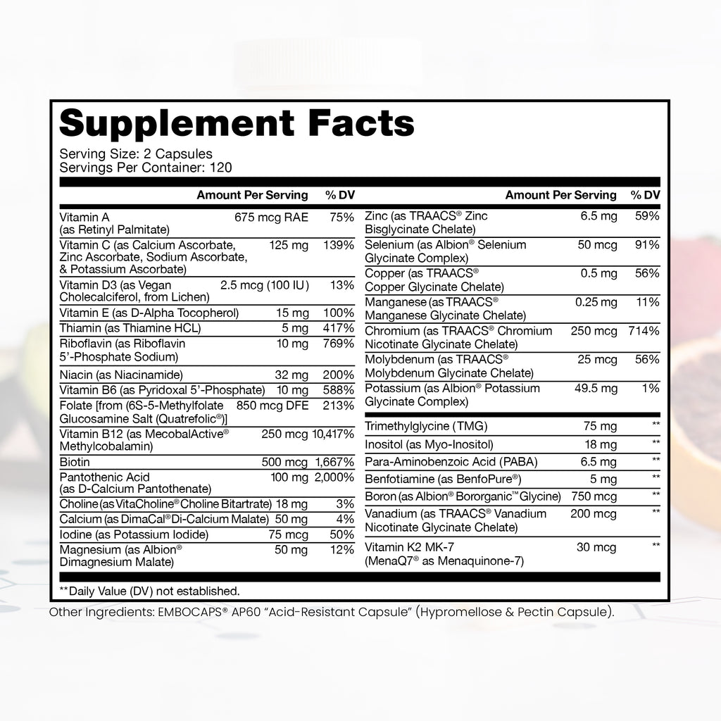Vitamin A (as Retinyl Palmitate) 420 mcg; Vitamin C (as Calcium Ascorbate, Zinc Ascorbate, Sodium Ascorbate, & Potassium Ascorbate) 125 mg; Vitamin D3 (as Vegan Cholecalciferol, from Lichen) 2.5 mcg (100 IU); Vitamin E (as D-Alpha mixed tocopherols) 67 mg; Thiamin (as BenfoPure® Benfotiamine) 10 mg; Riboflavin (as Riboflavin 5’-Phosphate Sodium) 10 mg; Niacin (as Niacinamide) 32 mg; Vitamin B6 (as Pyridoxal 5’-Phosphate) 10 mg; Folate [from (6S)-5-Methyltetrahydrofolate Glucosamine Salt (Quatrefolic®)] 850 mcg DFE; Vitamin B12 (as MecobalActive® Methylcobalamin) 250 mcg; Biotin 500 mcg; Pantothenic Acid (as D-Calcium Pantothenate) 100 mg; Calcium (as DimaCal® Di-Calcium Malate) 50 mg; Iodine (as Potassium Iodide) 50 mcg; Magnesium (as Albion® Dimagnesium Malate) 50 mg; Zinc (as TRAACS® Zinc Bisglycinate Chelate) 6.5 mg; Selenium (as Albion® Selenium Glycinate Complex) 50 mcg; Copper (as TRAACS® Copper Glycinate Chelate) 0.5 mg; Manganese (as TRAACS® Manganese Glycinate Chelate) 0.25 mg; Chromium (as TRAACS® Chromium Nicotinate Glycinate Chelate) 250 mcg; Molybdenum (as TRAACS® Molybdenum Glycinate Chelate) 25 mcg; Potassium (as Albion® Potassium Glycinate Complex) 49.5 mg; Trimethylglycine (TMG) 75 mg; Choline (as VitaCholine® Choline Bitartrate) 18 mg; Inositol (as Myo-Inositol) 18 mg; Para-Aminobenzoic Acid (PABA) 6.5 mg; Boron (as Albion® Bororganic™ Glycine) 750 mcg; Vanadium (as TRAACS® Vanadium Nicotinate Glycinate Chelate) 200 mcg; Vitamin K2 MK-7 (MenaQ7® as Menaquinone-7) 30 mcg