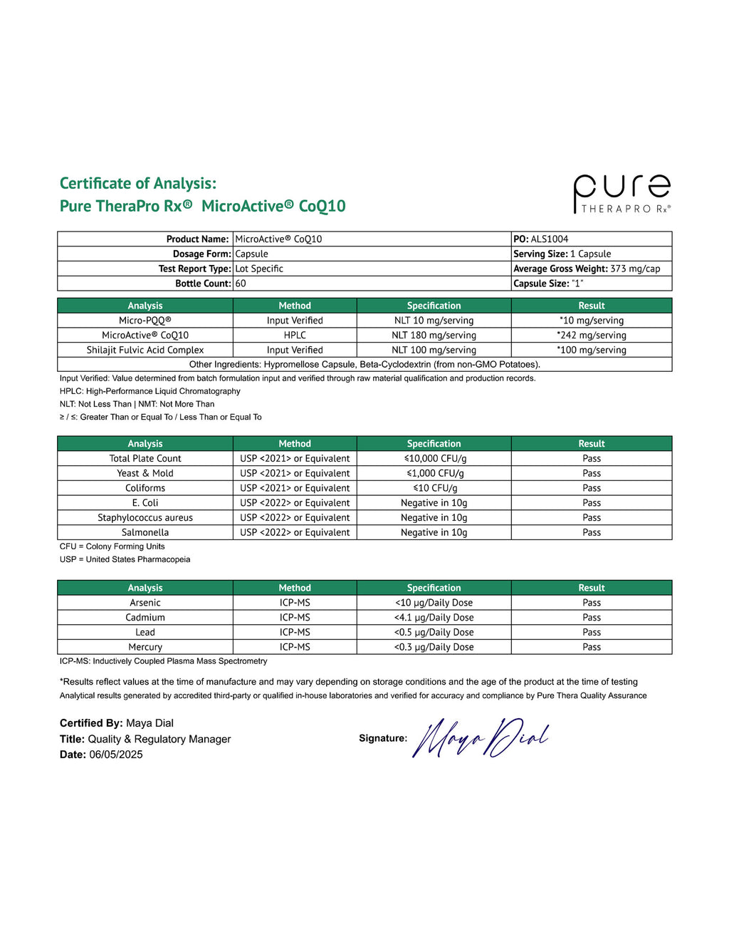 Coenzyme Q10 (as MicroActive® CoQ10 26%) 180mg, Shilajit Fulvic Acid Complex 100mg, MicroPQQ® (Pyrroloquinoline quinone) 10mg *provides the same benefits as 20mg of regular PQQ*