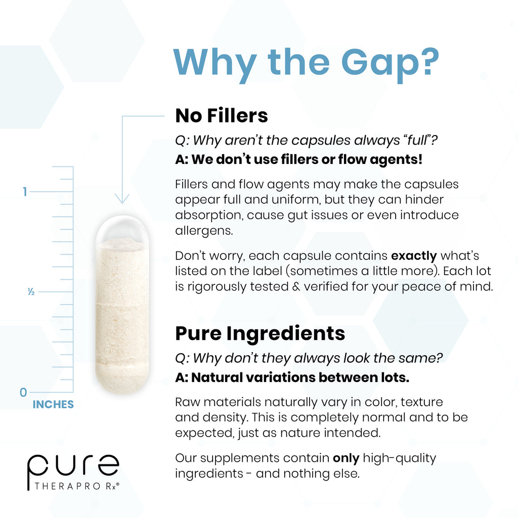 Pure TheraPro Rx® provides supplement solutions to ensure your body gets the micronutrients necessary to support total-body health and vitality. Pure TheraPro Rx® supplements do not contain any fillers such as rice flour, corn starch, or wood pulp fibers like cellulose. Our manufacturing facility adheres to strict NSF/cGMP (Current Good Manufacturing Practices) guidelines.