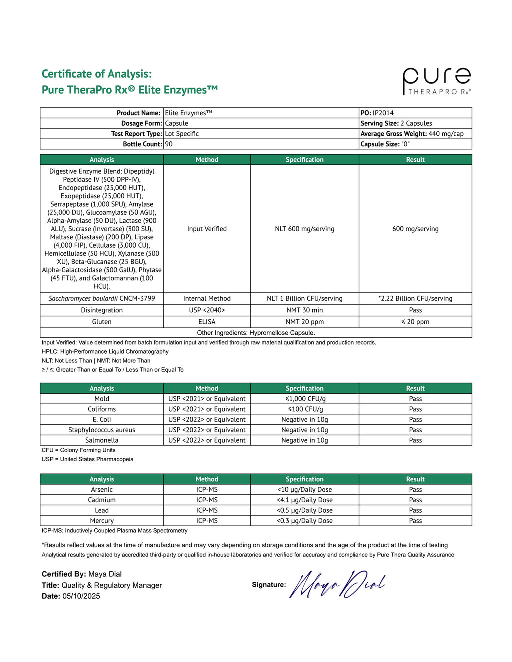 Pure TheraPro Rx’s Elite Enzymes Plus Probiotics is a full-spectrum digestive enzyme supplement formulated and manufactured in a cGMP & NSF-certified laboratory in the USA. We produce this formula without unnecessary ingredients or fillers.