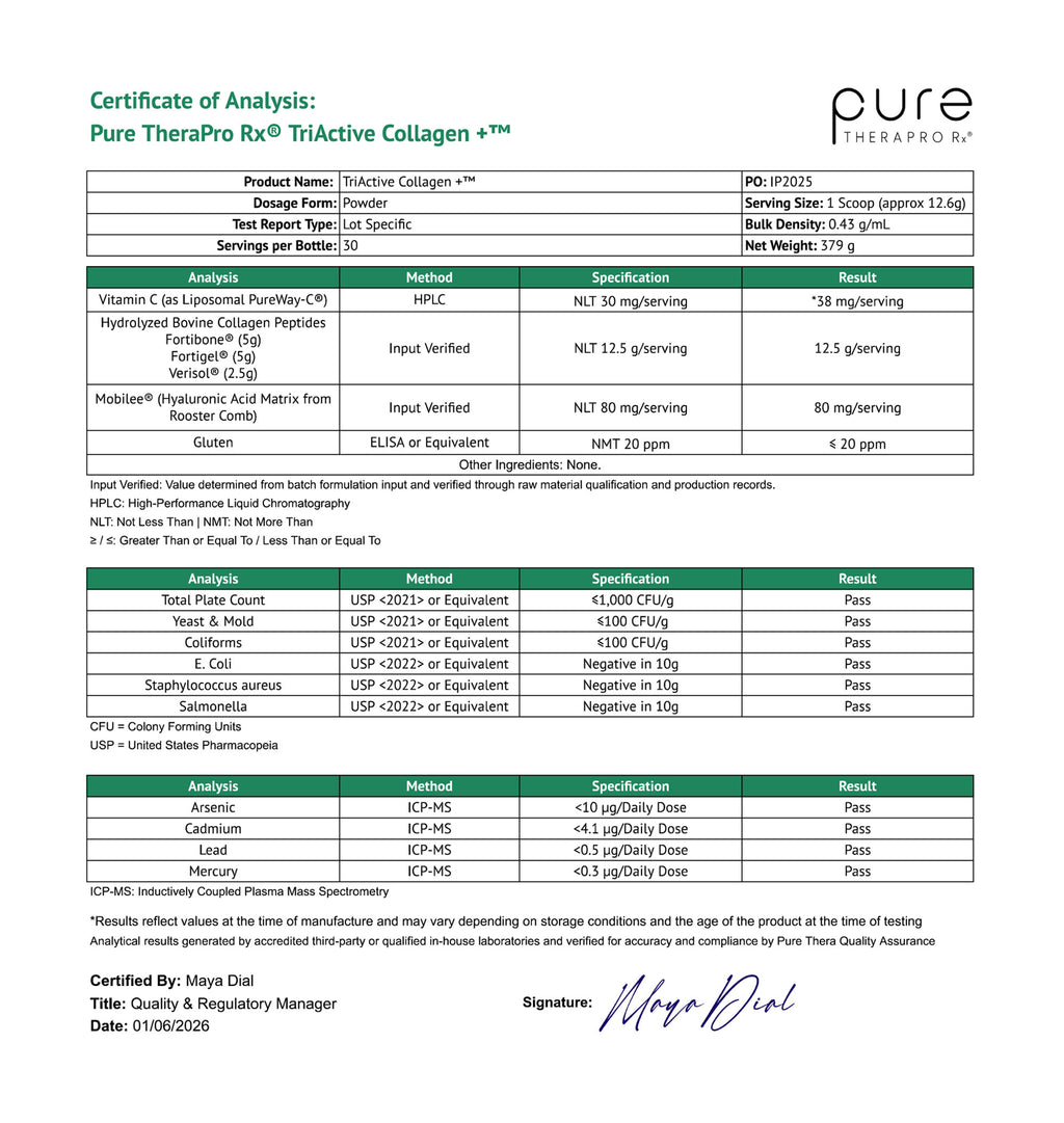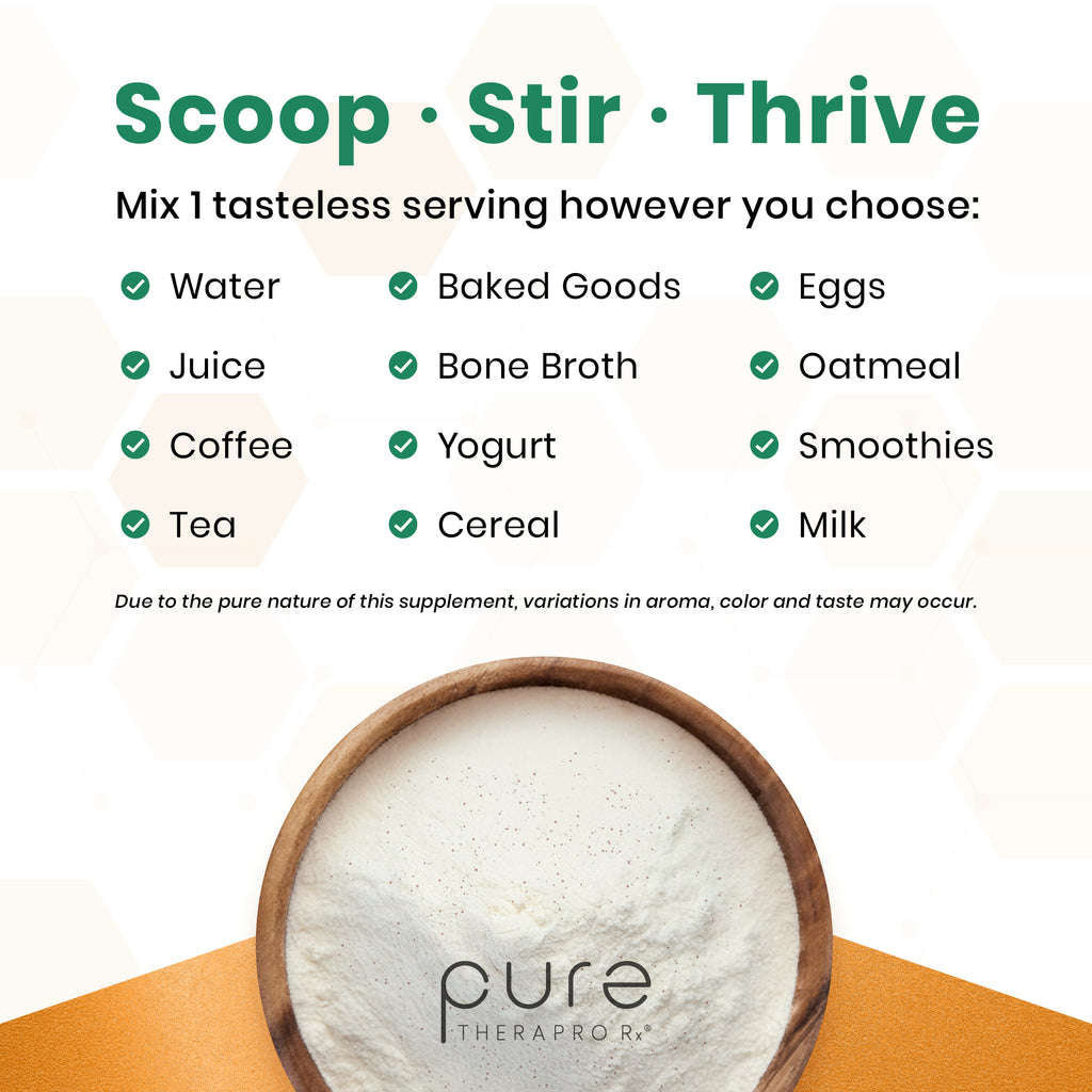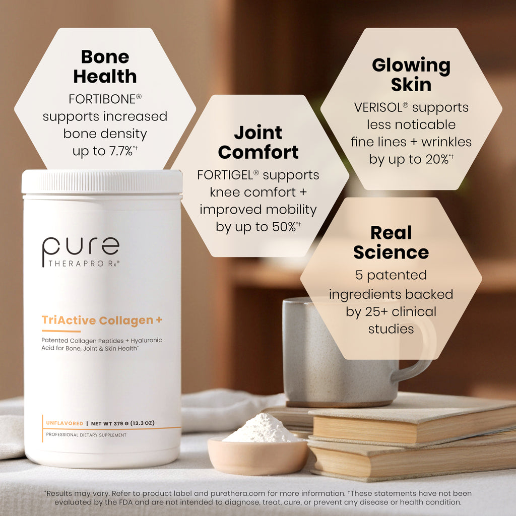 Pure TheraPro Rx® TriActive Collagen+™ is a hydrolyzed multi-Collagen protein powder supplement completely in a class of its own. It contains a wholly unique and clinically studied blend of patented Collagen peptides alongside highly beneficial co-factors, all in clinical dosing.