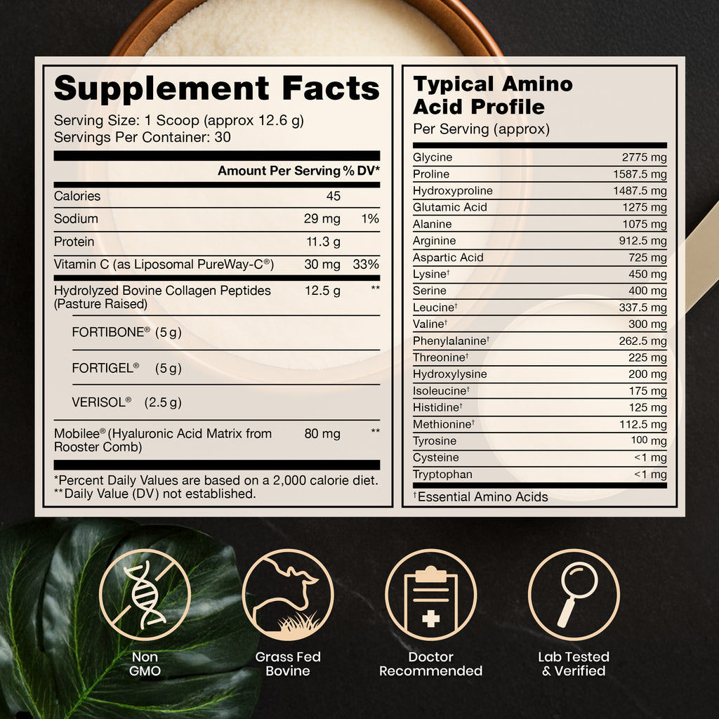 See Images for complete list of supplement facts. Contains patented FORTIBONE®, FORTIGEL® & VERISOL® Types I & III Collagen, Mobilee® Hyaluronic Acid Complex from Rooster Comb & PureWay-C® Liposomal Vitamin C