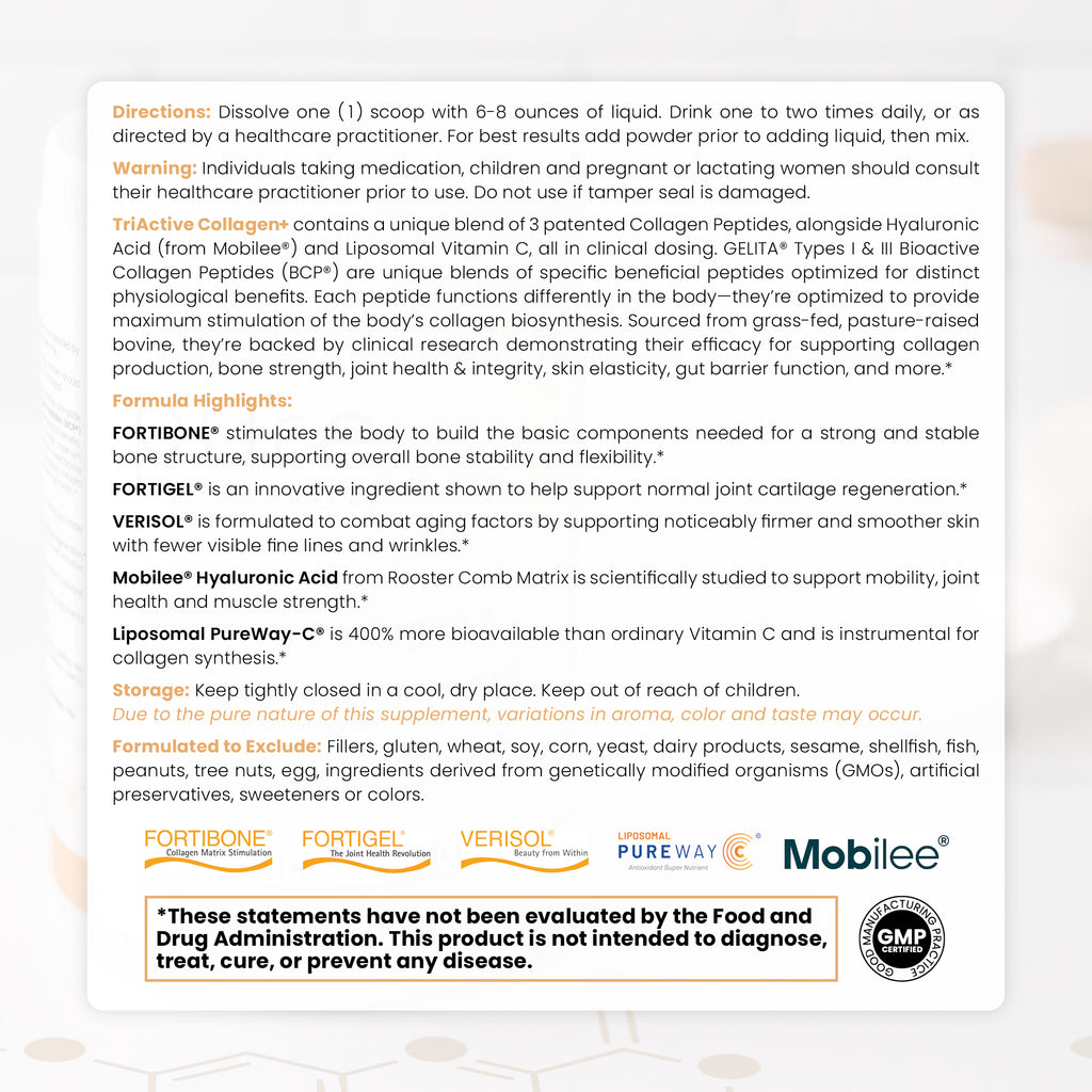 CLINICALLY STUDIED PATENTED COLLAGEN: TriActive Collagen + is made with only the finest patented Hydrolyzed Collagen Peptides on the planet.
